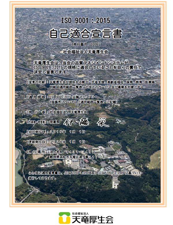 自己適合宣言書 自己適合宣言書 自己適合宣言書 (PDF ファイル 0.65MB) 適用範囲一覧表 適用規格:ISO 9001:2015品質マニュアル第10版 2025年4月1日発行 事業所の住所はこちらをご参照ください 本部・その他 適用範囲一覧表(本部・その他) (PDF ファイル 0.14MB) 施設サービス事業部 適用範囲一覧表(施設サービス事業部) (PDF ファイル 0.16MB) 地域福祉事業部 適用範囲一覧表(地域福祉事業部) (PDF ファイル 0.23MB) 就労支援事業部 適用範囲一覧表(就労支援事業部) (PDF ファイル 0.12MB) 子育て支援事業部 適用範囲一覧表(子育て支援事業部) (PDF ファイル 0.2MB)