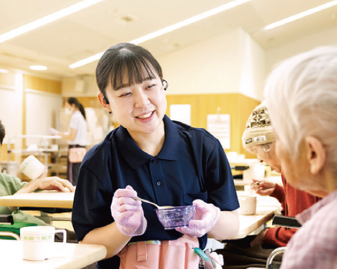 主に、食事や排泄、移乗などの日常生活の支援や、環境整備などを行っています。月に1 回ほど各グループで行事を開催しており、大きな行事の際には、職員同士で協力して実施しています。ご利用者との時間を大切にしながら、日々の業務に取り組んでいます。