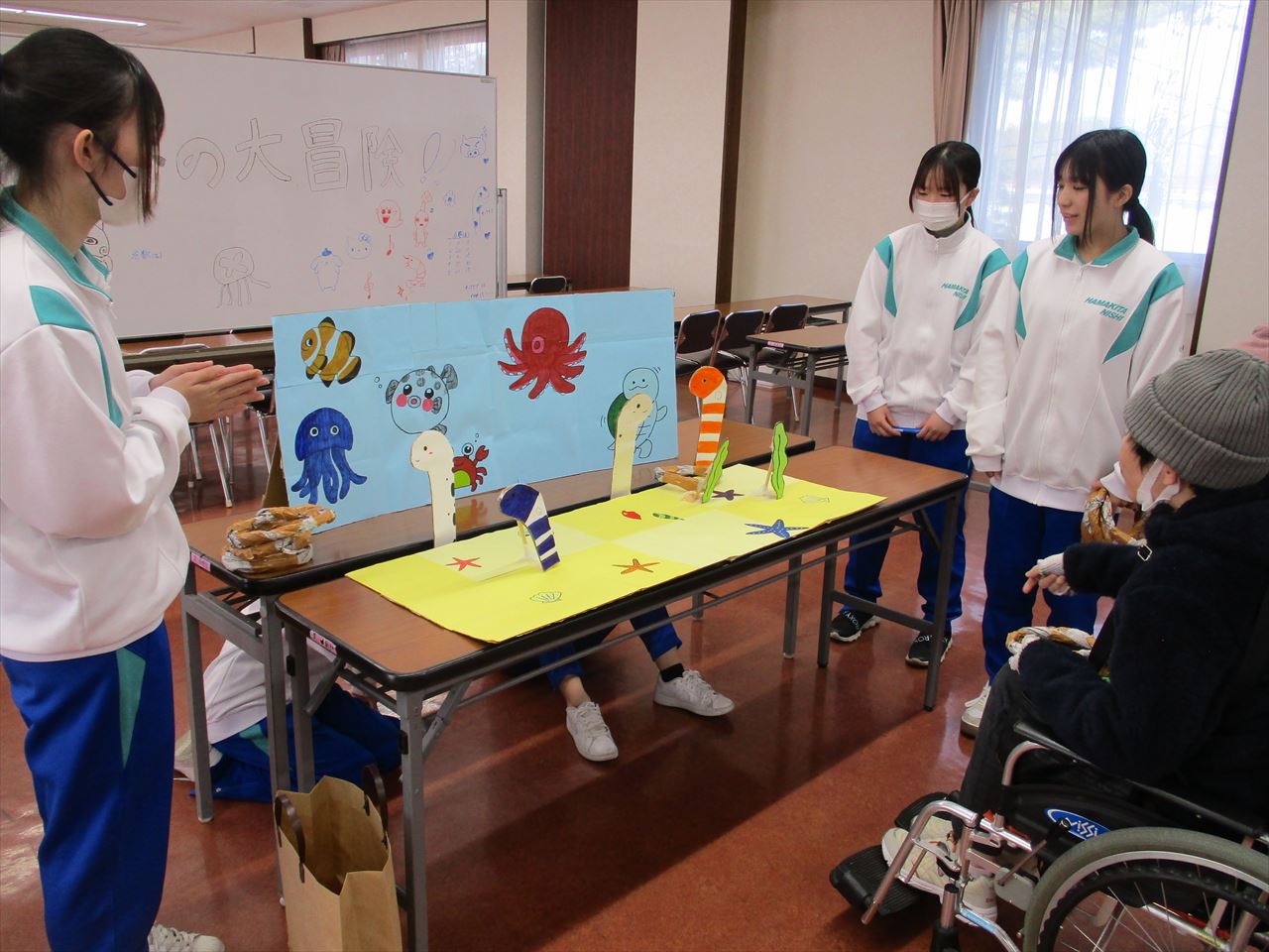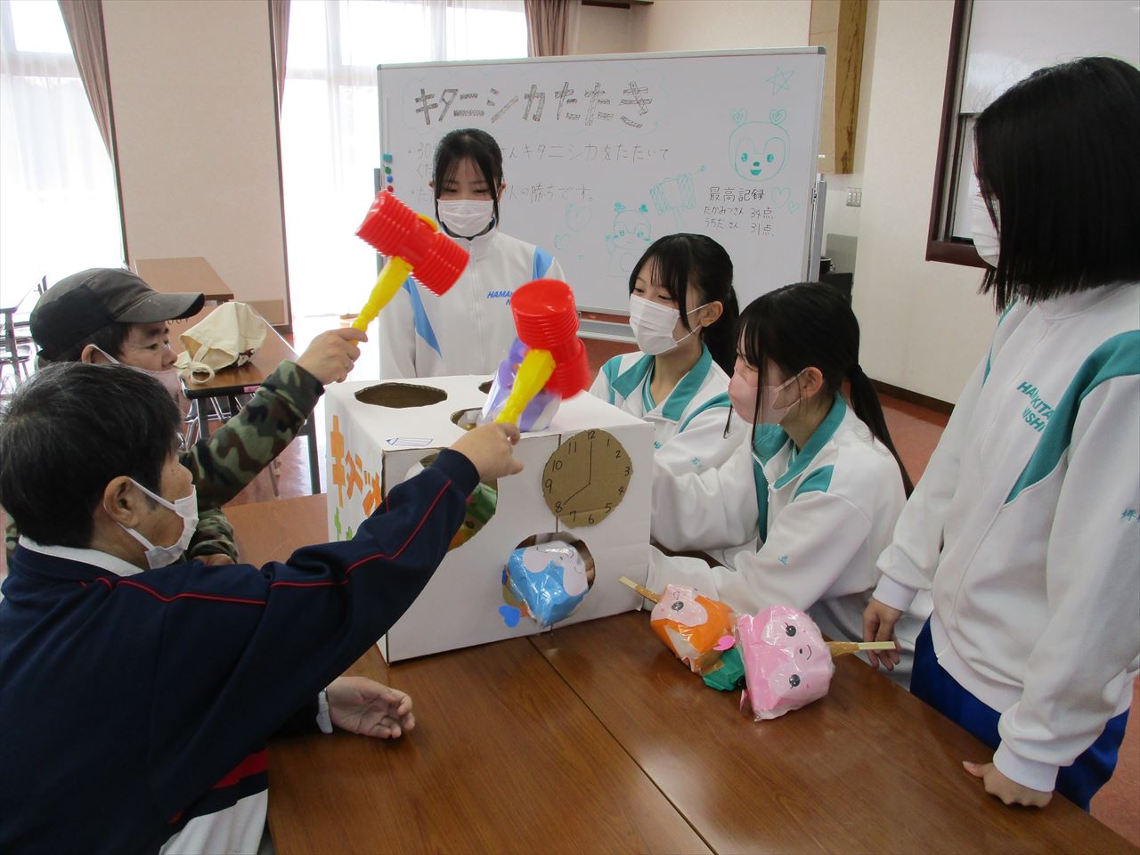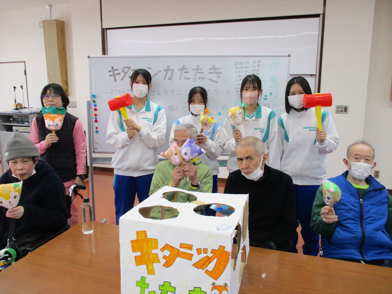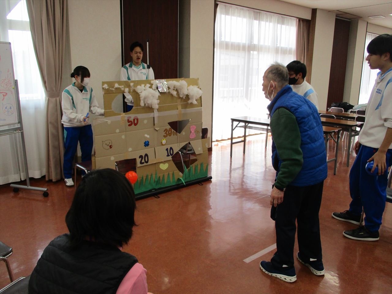 今回の企画は、ボランティア部のみなさんと一緒に1月から準備を進めてきました。学生たちは「どのような遊びにしたら喜んでもらえるか」「どのようなルールならみんなで楽しめるか」等を考え、工夫を凝らしながら「キタニシカたたき(もぐらたたき)」「海の大冒険(輪投げ)」「みんなの心を射ぬけ(ピンポン玉で的を狙うゲーム)」「北西SHOT(ボールを投げて得点を競うゲーム)」の4つの遊びを企画してくださいました。